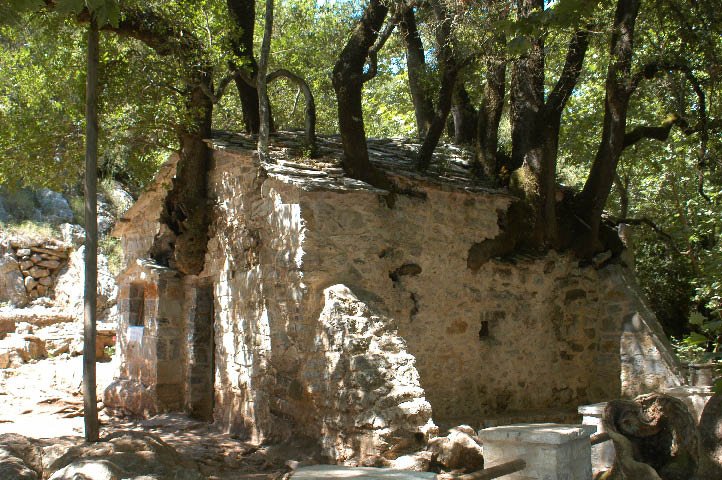 Aghia Theodora, an 11th or 12th century chapel with trees growing from its walls and roof.
