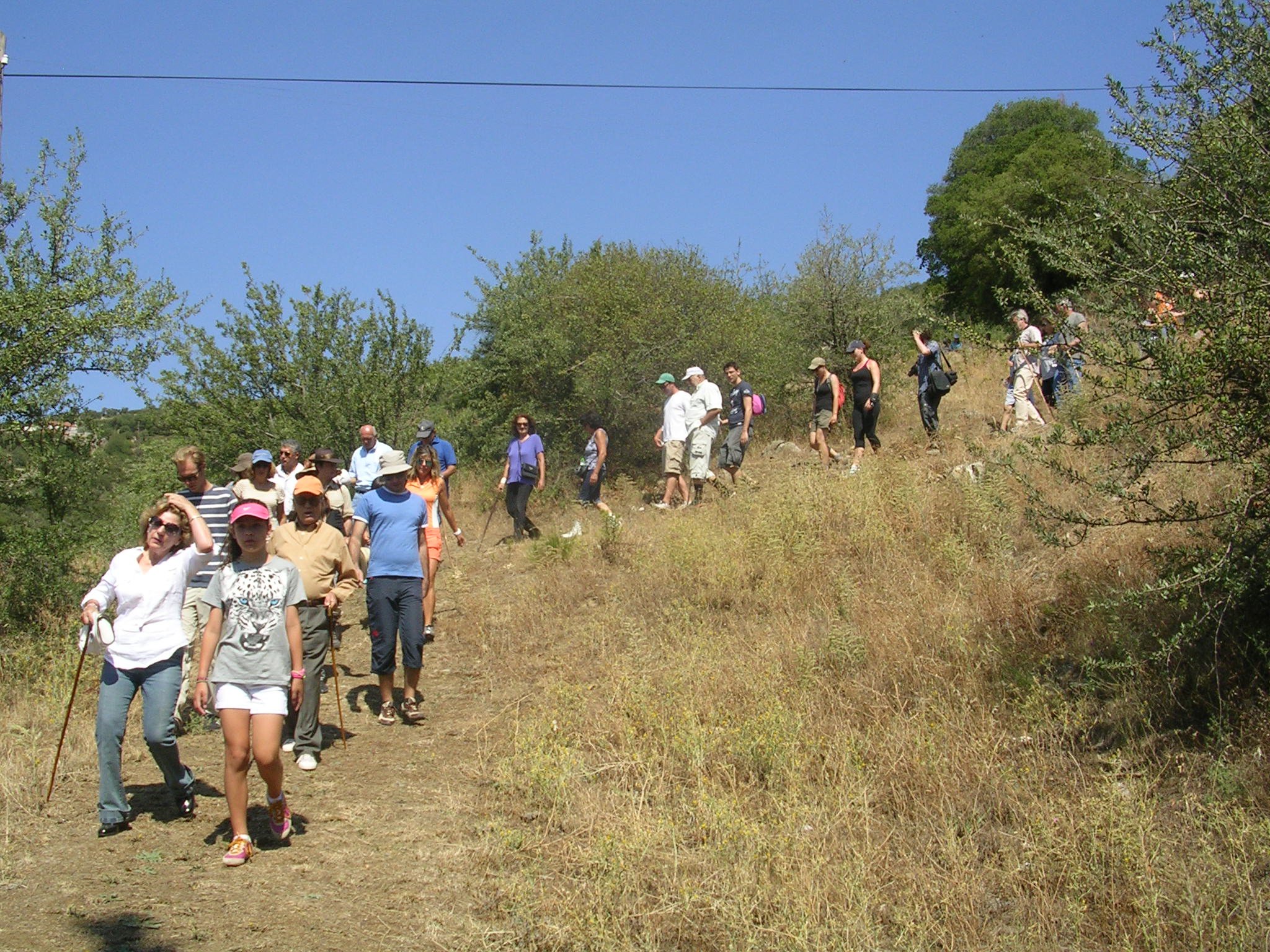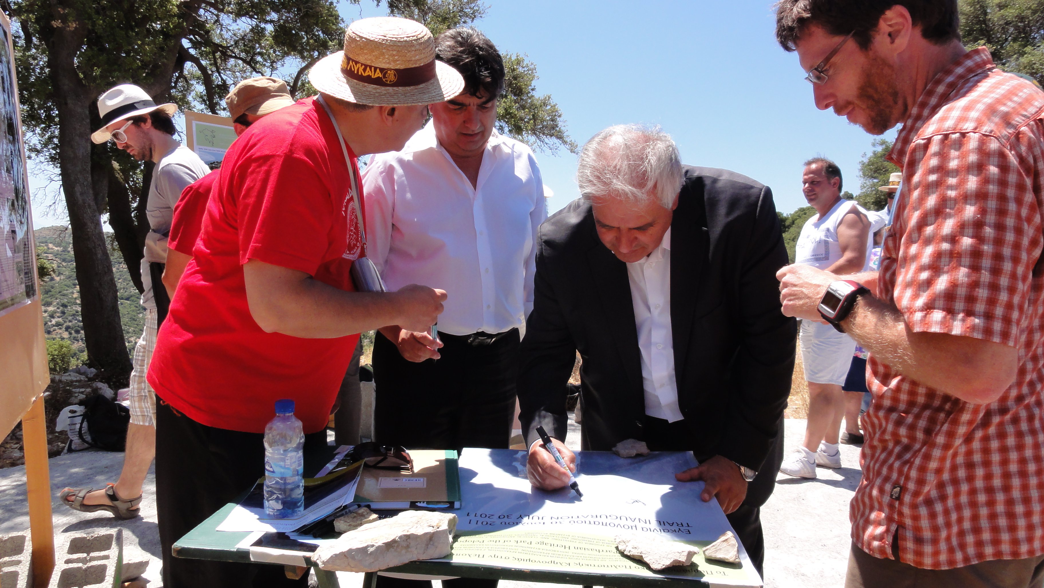 The Trail of Pan was the first Parrhasian Park trail to open on July 30, 2011. Thirty-five villagers together with local and regional dignitaries left the two villages at 10 am and met near the political boundary for a signing ceremony. Attending the ceremony were Mr. Evangelos Giannakouras, Governor of Arcadia, Dr. Takis Bouras, Mayor of Megalopolis, Dr. Anna Karapanagiotou, Ephor of the ΛΘ’ Ephoreia of Prehistoric and Classical Antiquities, Dr. David Gilman Romano, Co-Director of the Mt. Lykaion Excavation and Survey Project together with members of the Mt. Lykaion Excavation and Survey Project and the Parrhasian Heritage Park Field School participants.