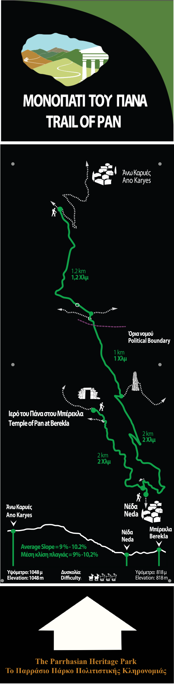 The Trail of Pan extends from the village of Ano Karyes (Arcadia) to the village of Neda (Messenia), a total of 5.65 km. The trail connects the provinces of Arcadia and Messenia, and includes beautiful vistas to the north and west of the upper Neda river valley, the site of the Sanctuary of Pan at Berekla, and a portion of the south face of Mt. Lykaion, including the Ash Altar.